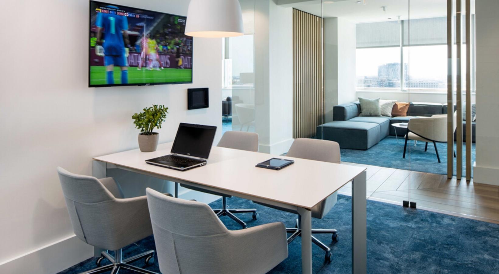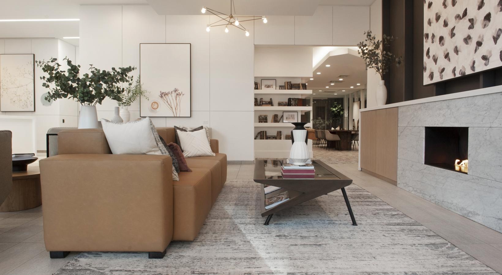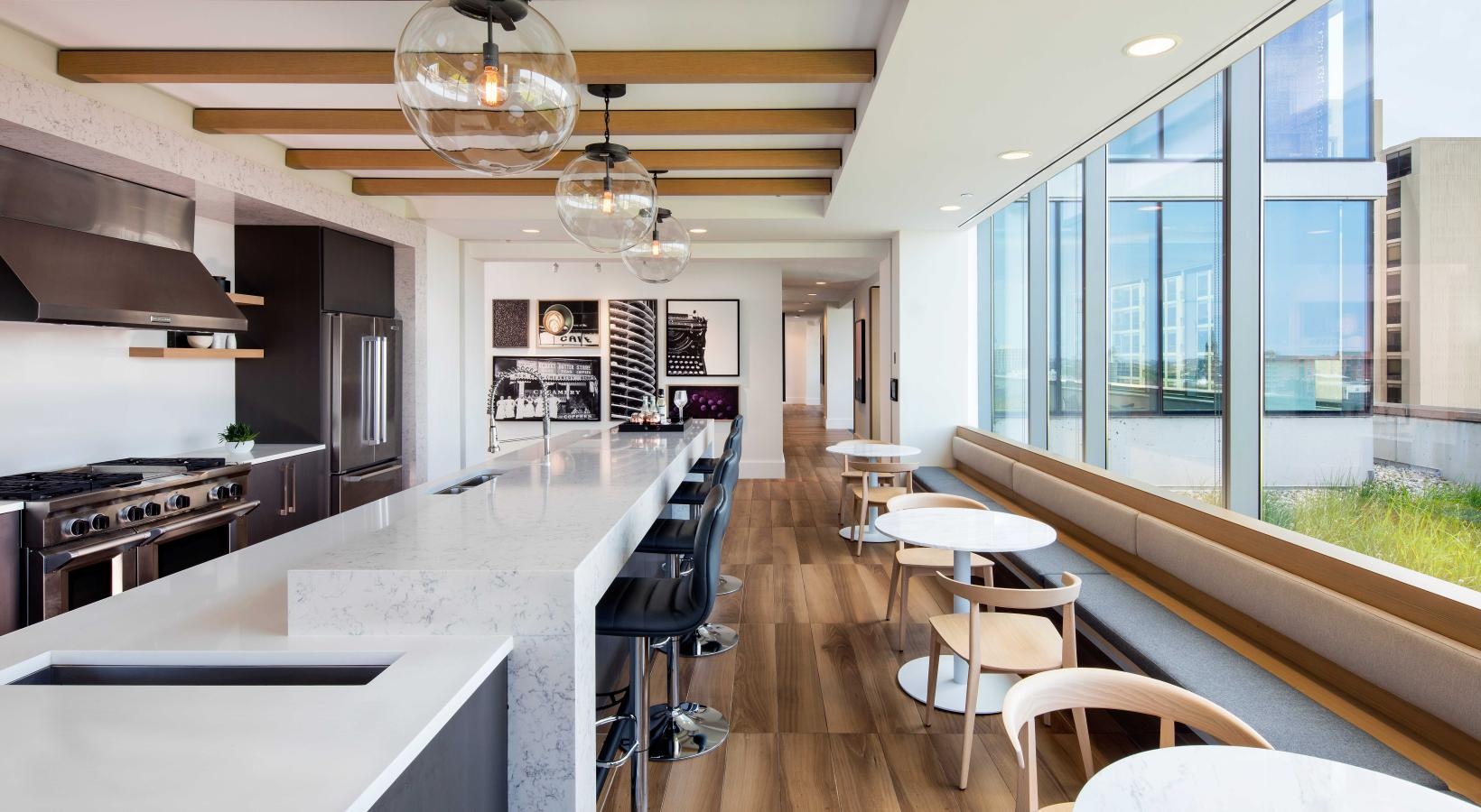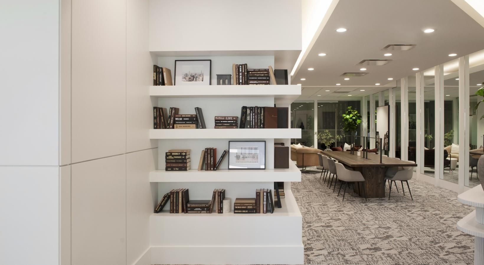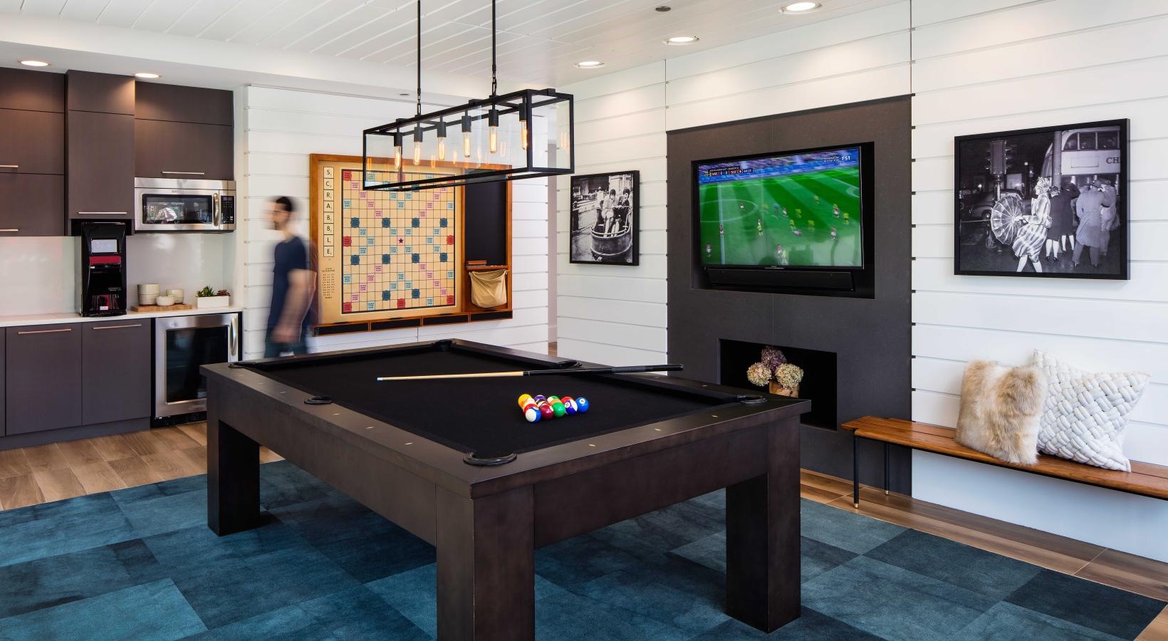 a book shelf and a chair by large windows lounge with pool table and tv resort style pool with seating and a red wall a kitchen with a large window